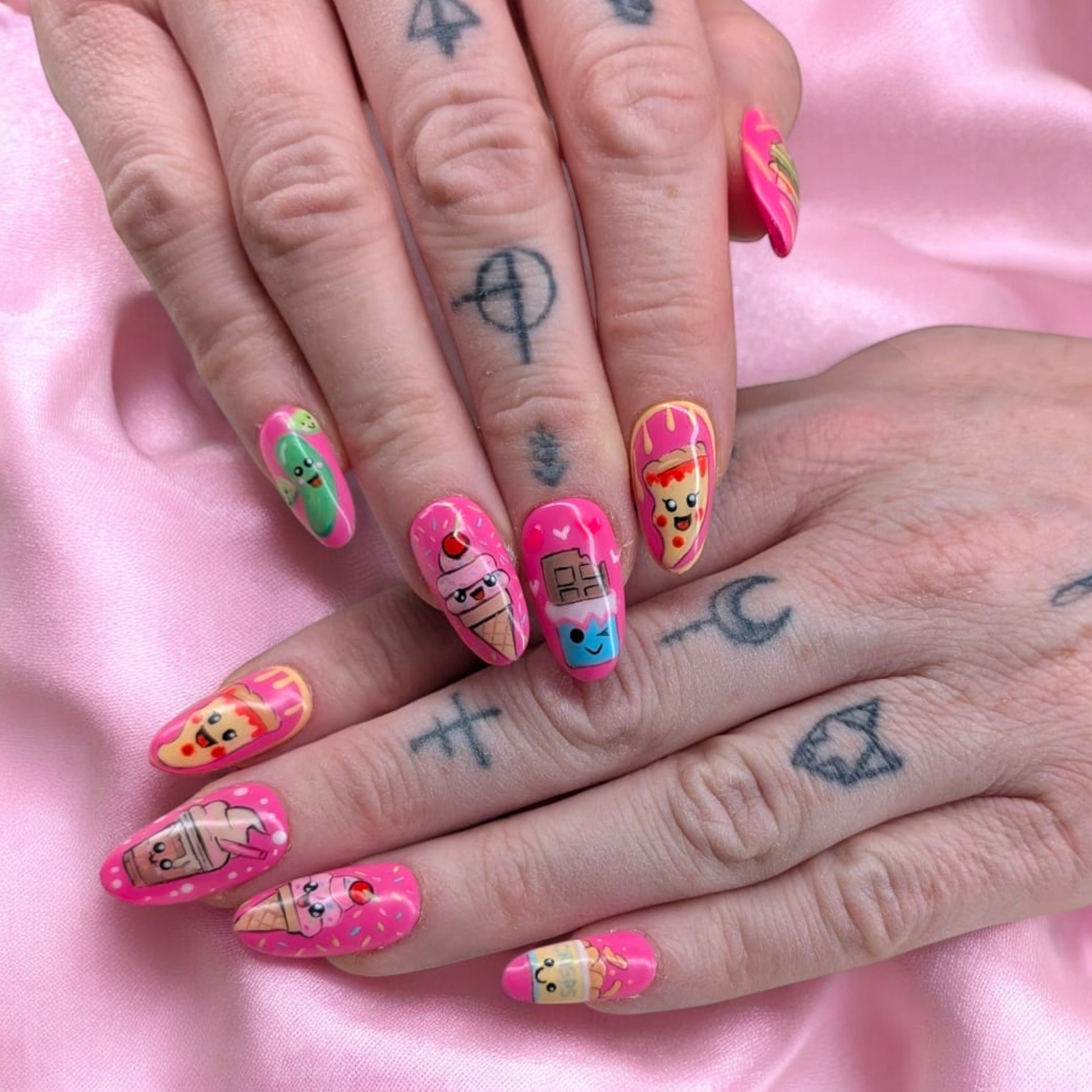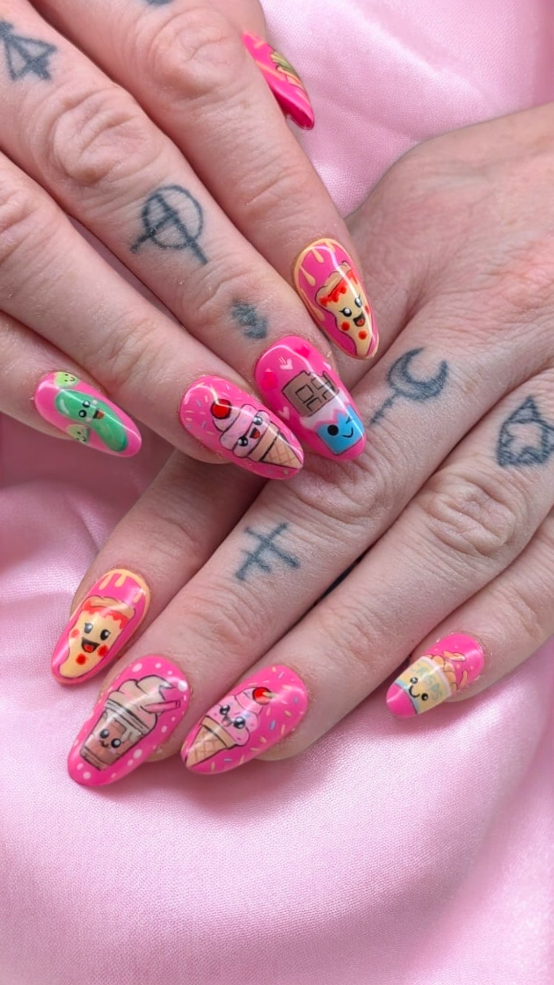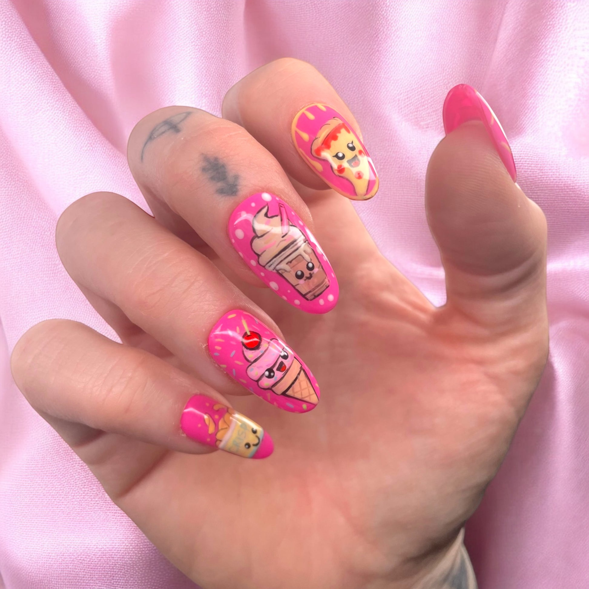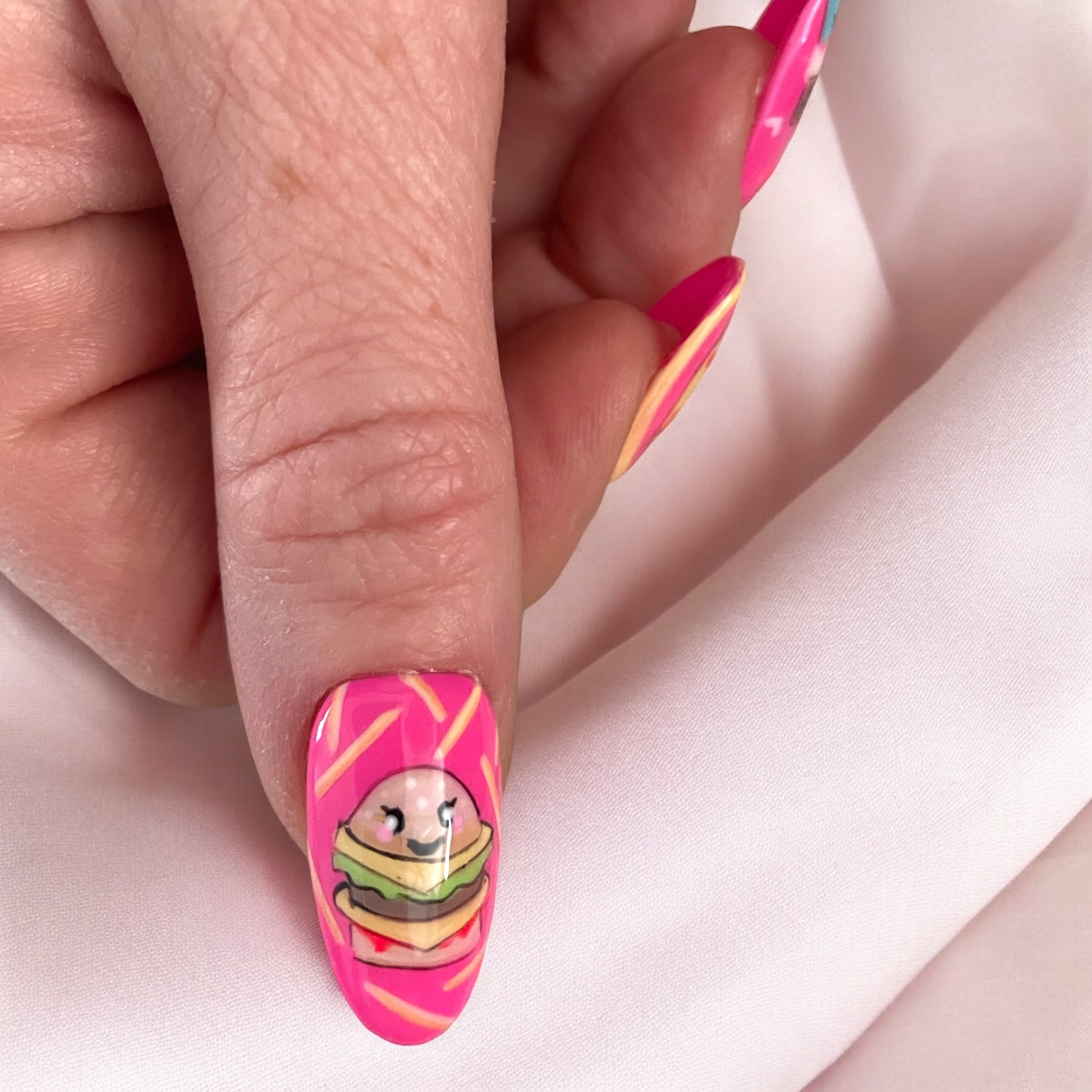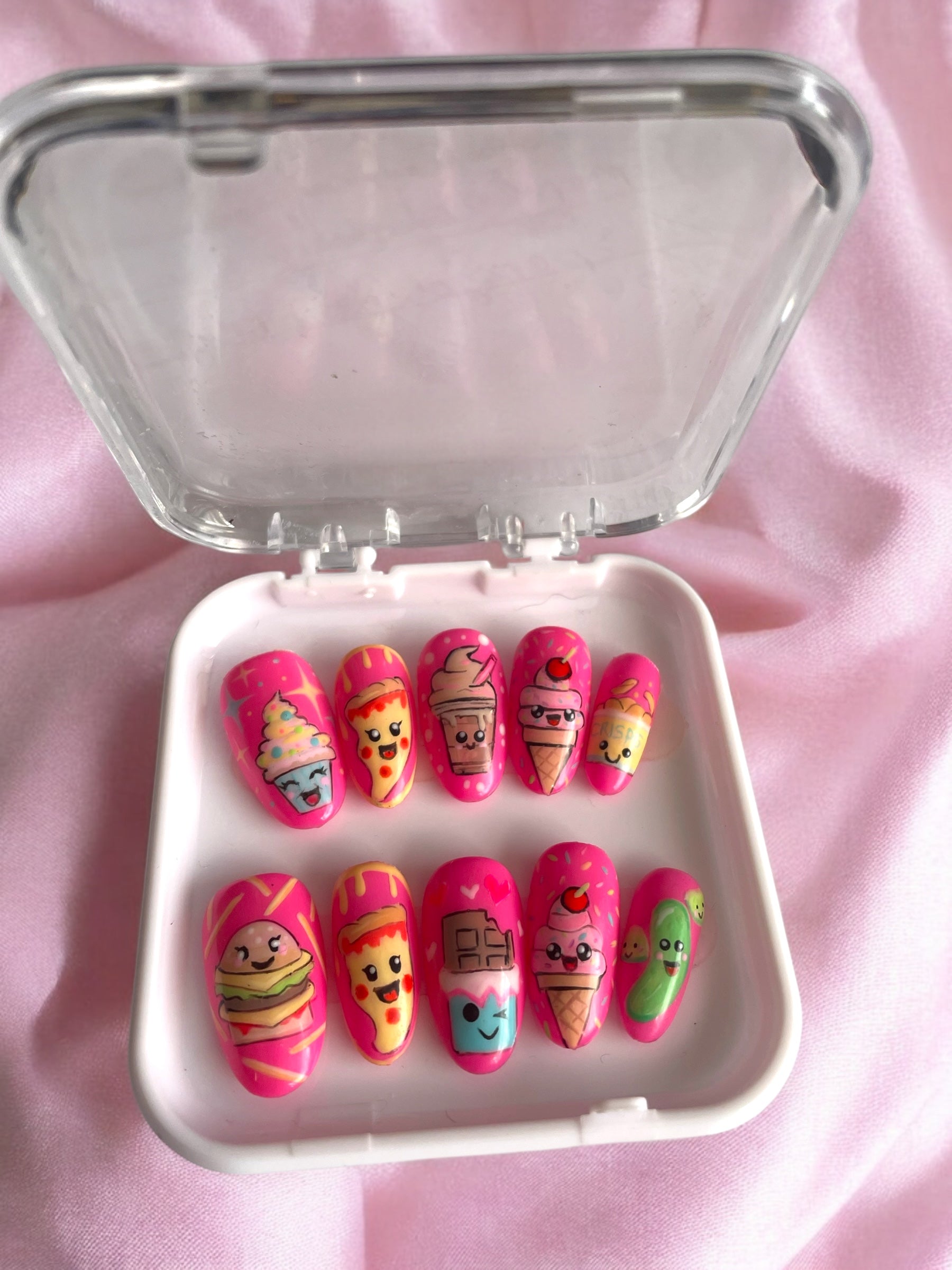 Serving up some serious cuteness! This playful, hand-painted set features all your fave snacks with adorable faces. From pizza to burgers, milkshakes to ice cream. bright pink base with KawIi vibes all the way.