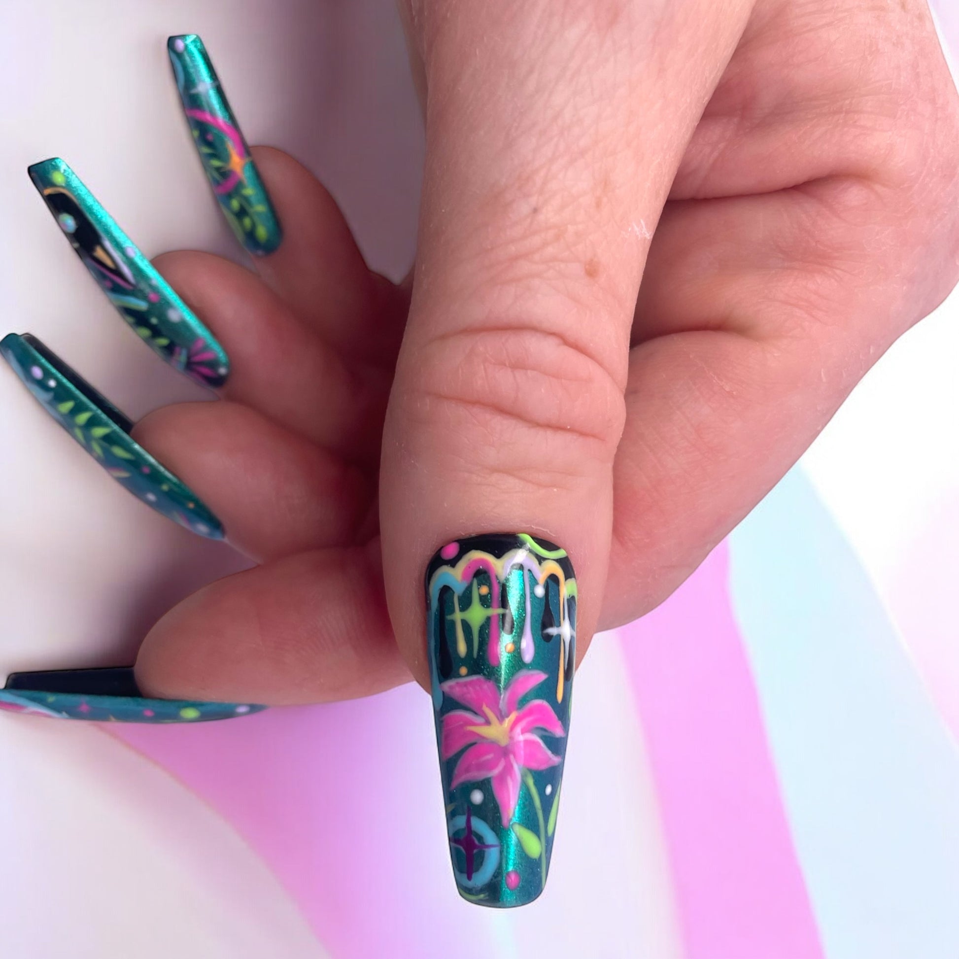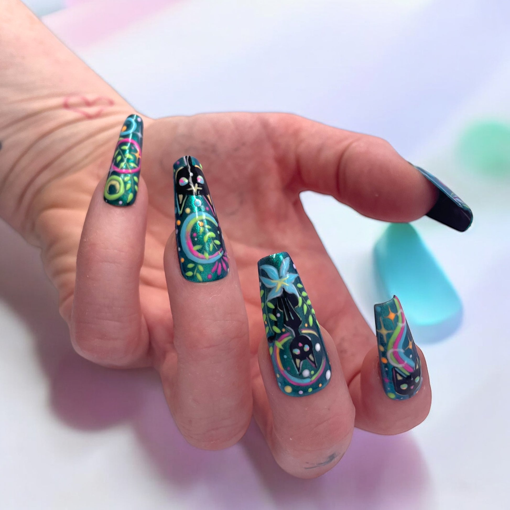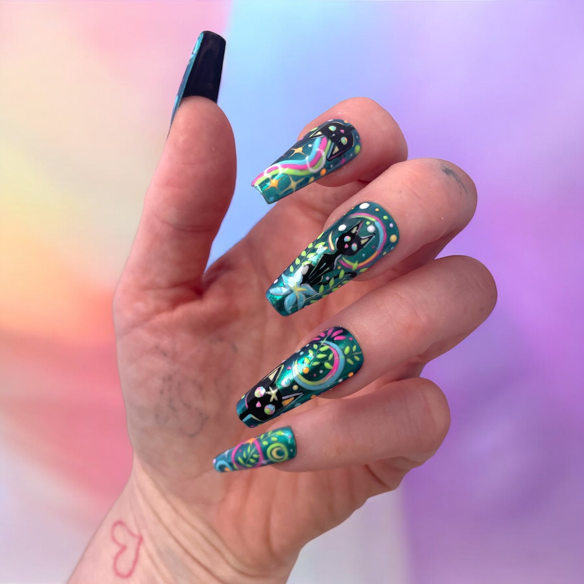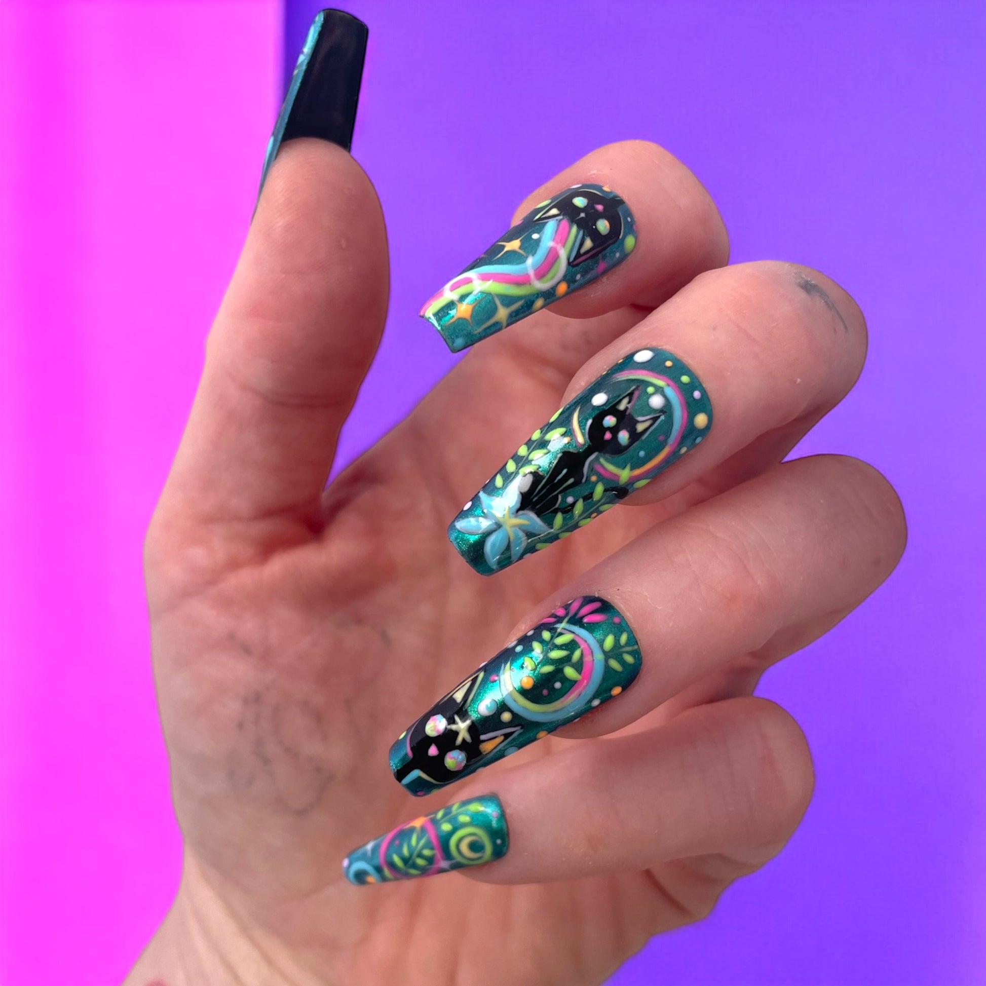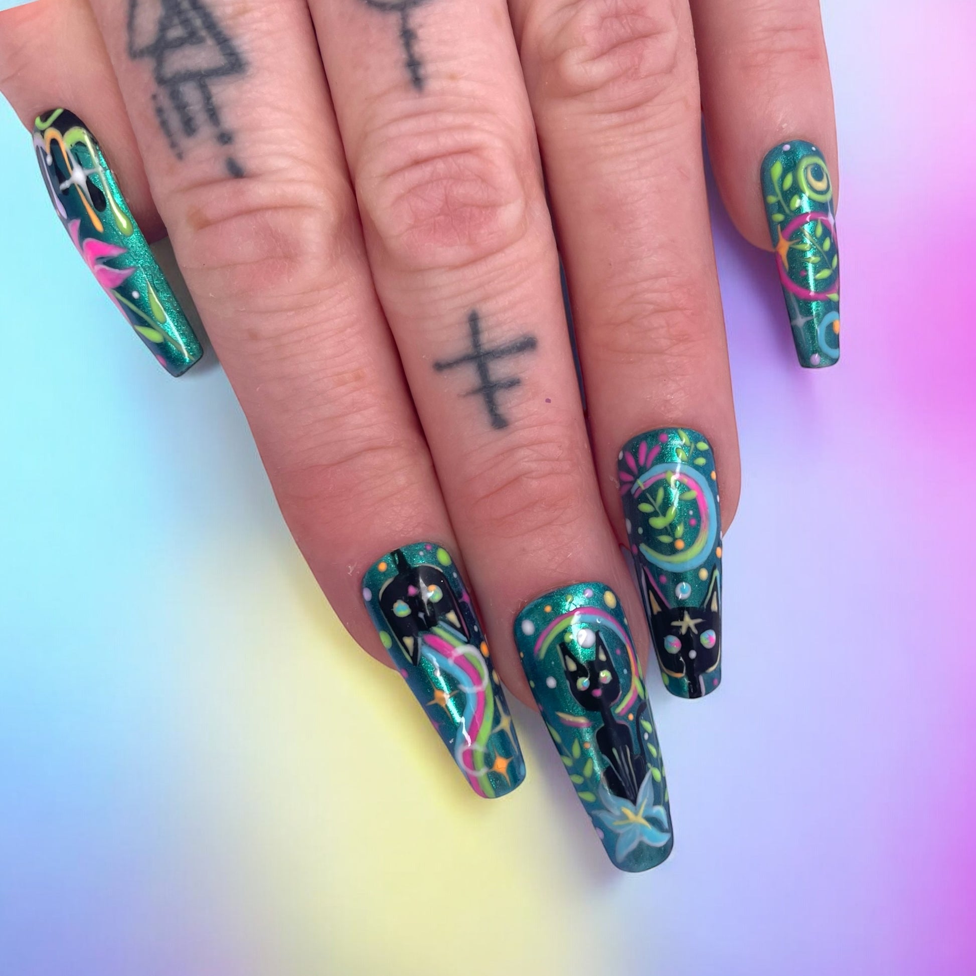 A playful blend of celestial vibes and jungle energy. featuring a black cat, bold floral line work, and vibrant metallic green base. It’s fierce , fun, and full of detail