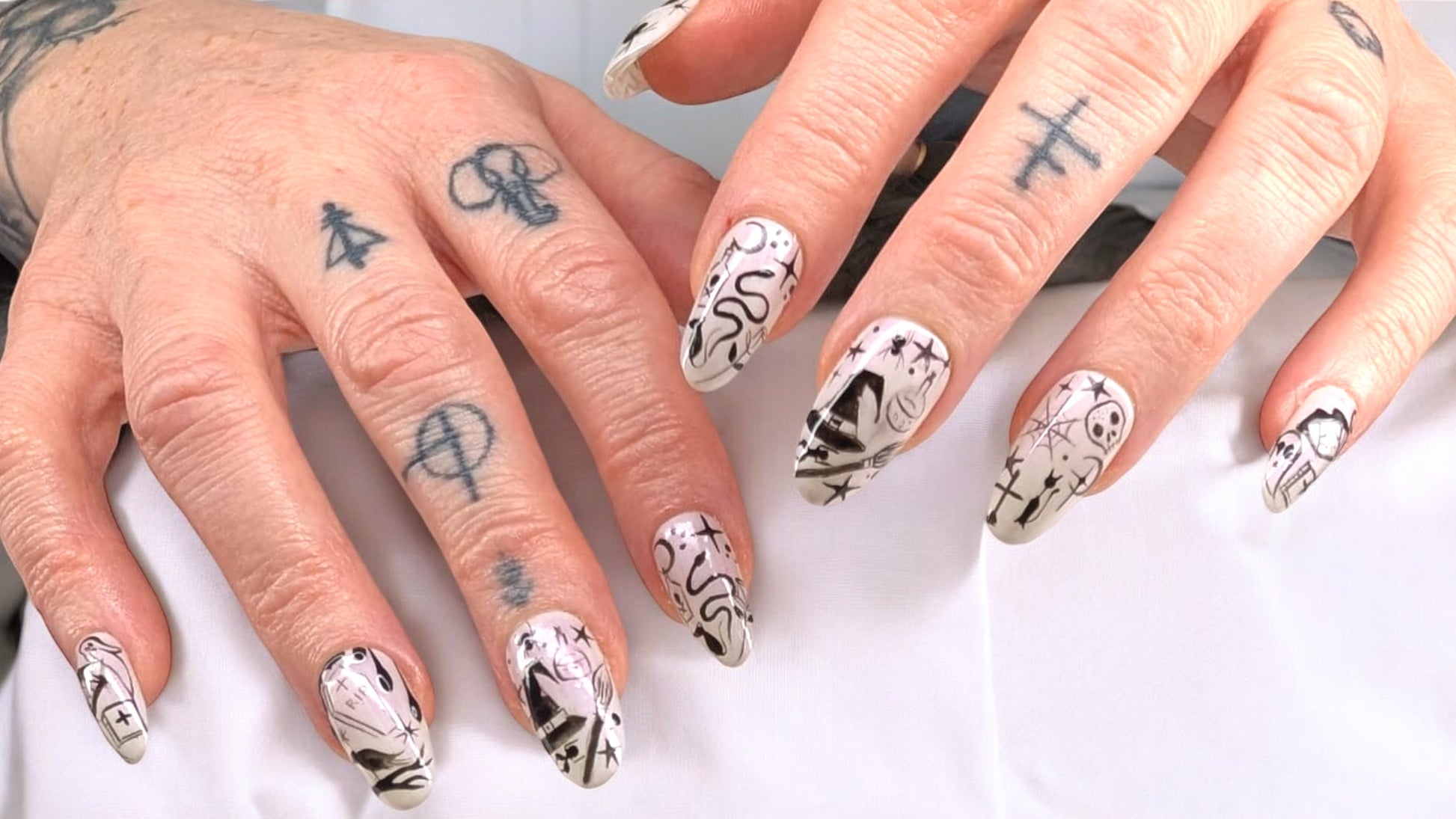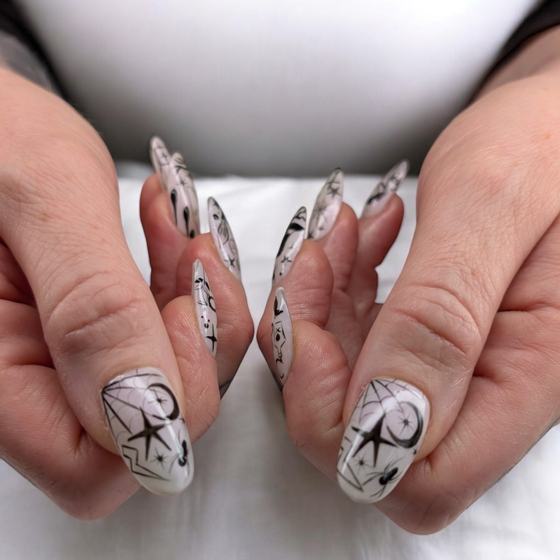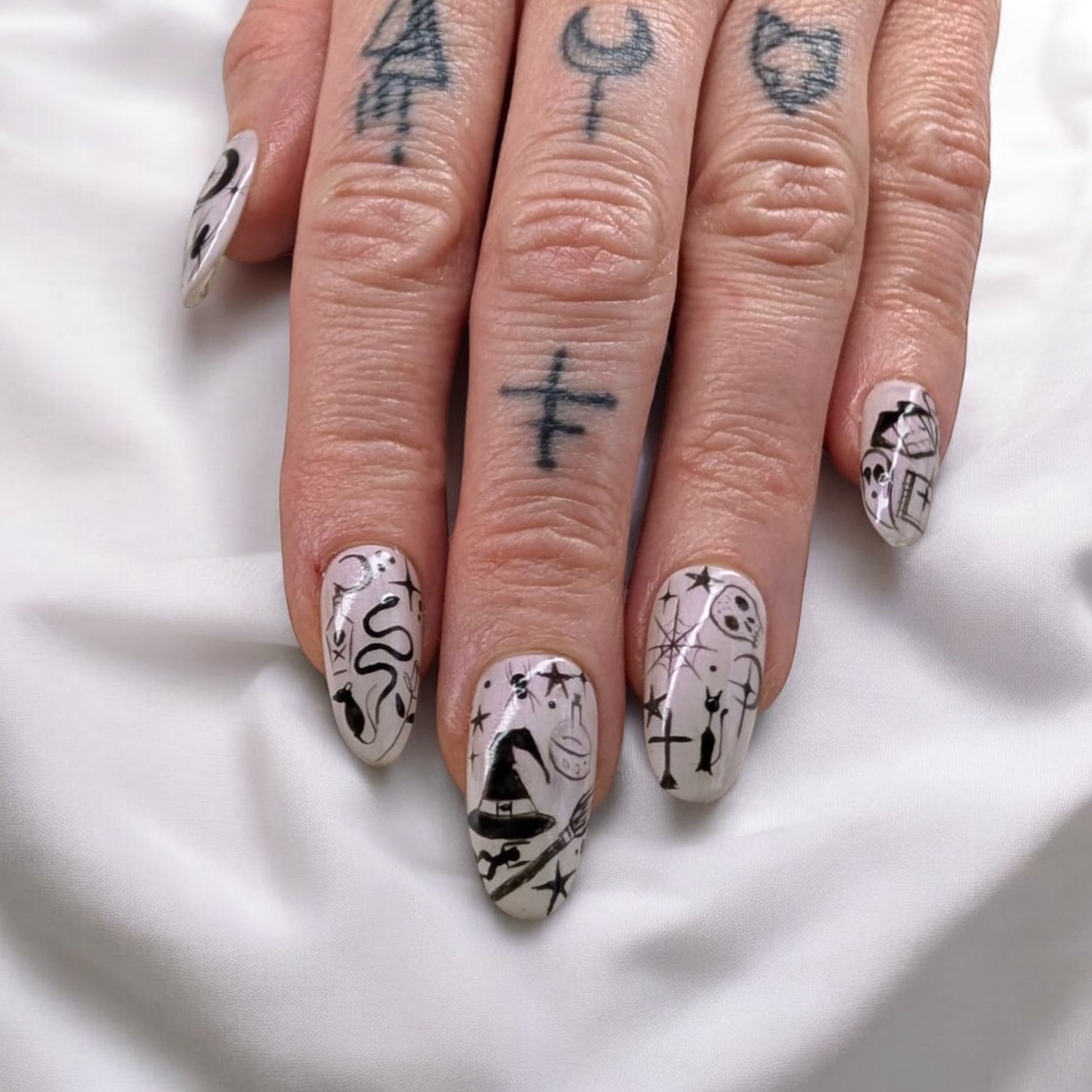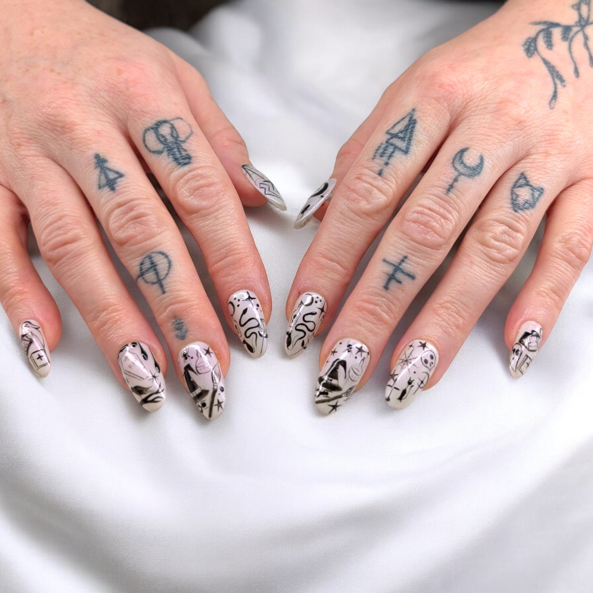 Bring a touch of eerie elegance to your nails this Halloween with this black and white spooky line art set. Each nail is hand-painted with intricate Halloween-inspired designs think ghosts, stars, snakes, and mysterious symbols for a look that’s bold, chic, and totally unique.